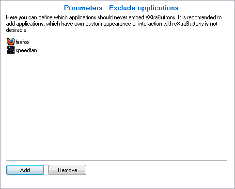 Here you can define which application should never embed eXtra Buttons. It is recommended to add applications with own custom appearance (skins).